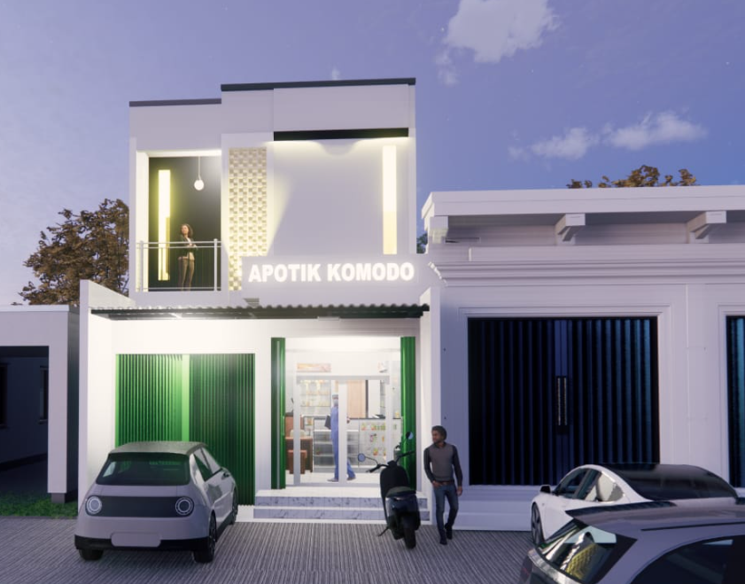 Desain Apotek 2 Lantai 6×15 m – Bekasib. Desain 100-200 M2 DESAIN RUMAH IBU C – BEKASI – LUAS 220/120 M2 – RUMAH 2 LANTAI – GAYA MODERN MINIMALIS APOTEK (3M x 10M); CARPORT; R. TAMU; R. KELUARGA; DAPUR; 4 KAMAR TIDUR; 2 KAMAR MANDI; BALKON; AREA JEMUR